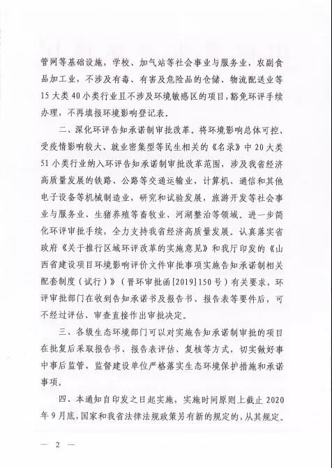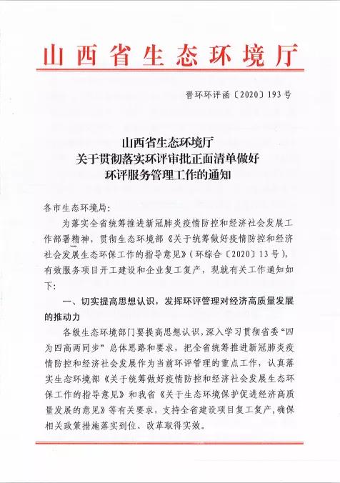 山西生態環境廳連發晉環環評函【2020】192號、193號文件,貫徹落實環評審批正面清單