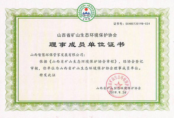 山西省礦山生態(tài)環(huán)境保護協(xié)會理事成員單位證書 瀏覽:1797